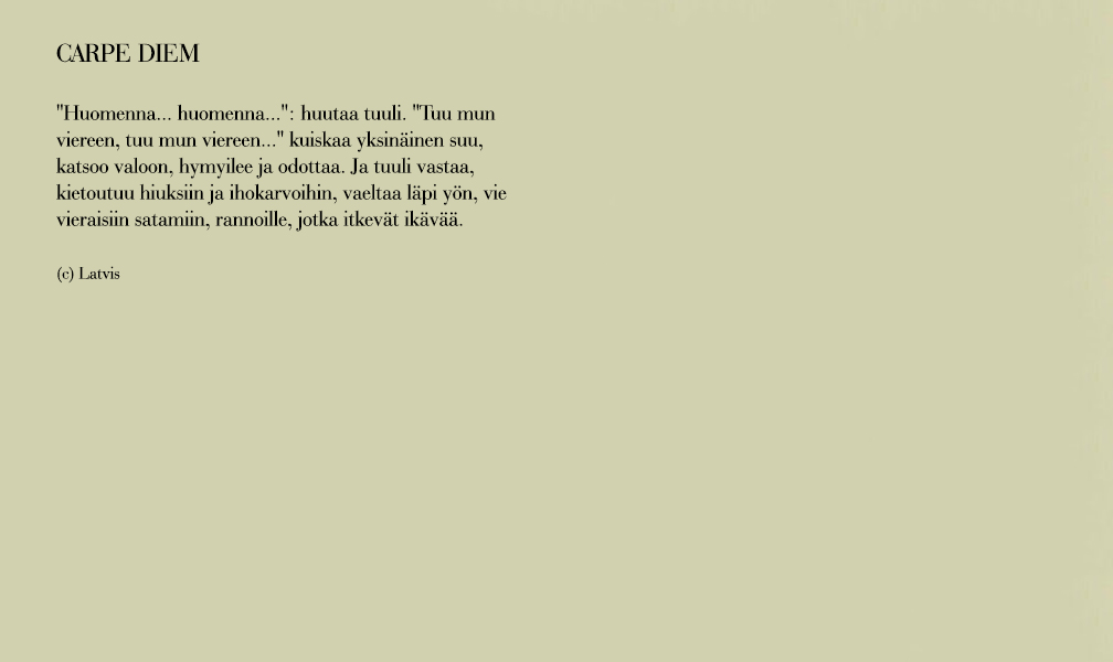 Yaffa kääntyy ja lähtee kävelemään steissille päin. Mä jään istumaan siihen Ostarin rappusille ja katson sen perään kun se katoaa kulman taakse. On mielettömän pimeetä ja hiljaista. Tuhannet tähdet, jossain kaukana, tunteettomina kiertävät radoillaan ihan kuin me ihmiset täällä alhaalla. Näyttää kuin ne putoaisivat, mutta ne ovat lumihiutaleita, jotka vääristyvät kasvoiksi kyynelteni läpi. On hiljaista. Liekit ovat sammuneet Jeanne d´Arc...
